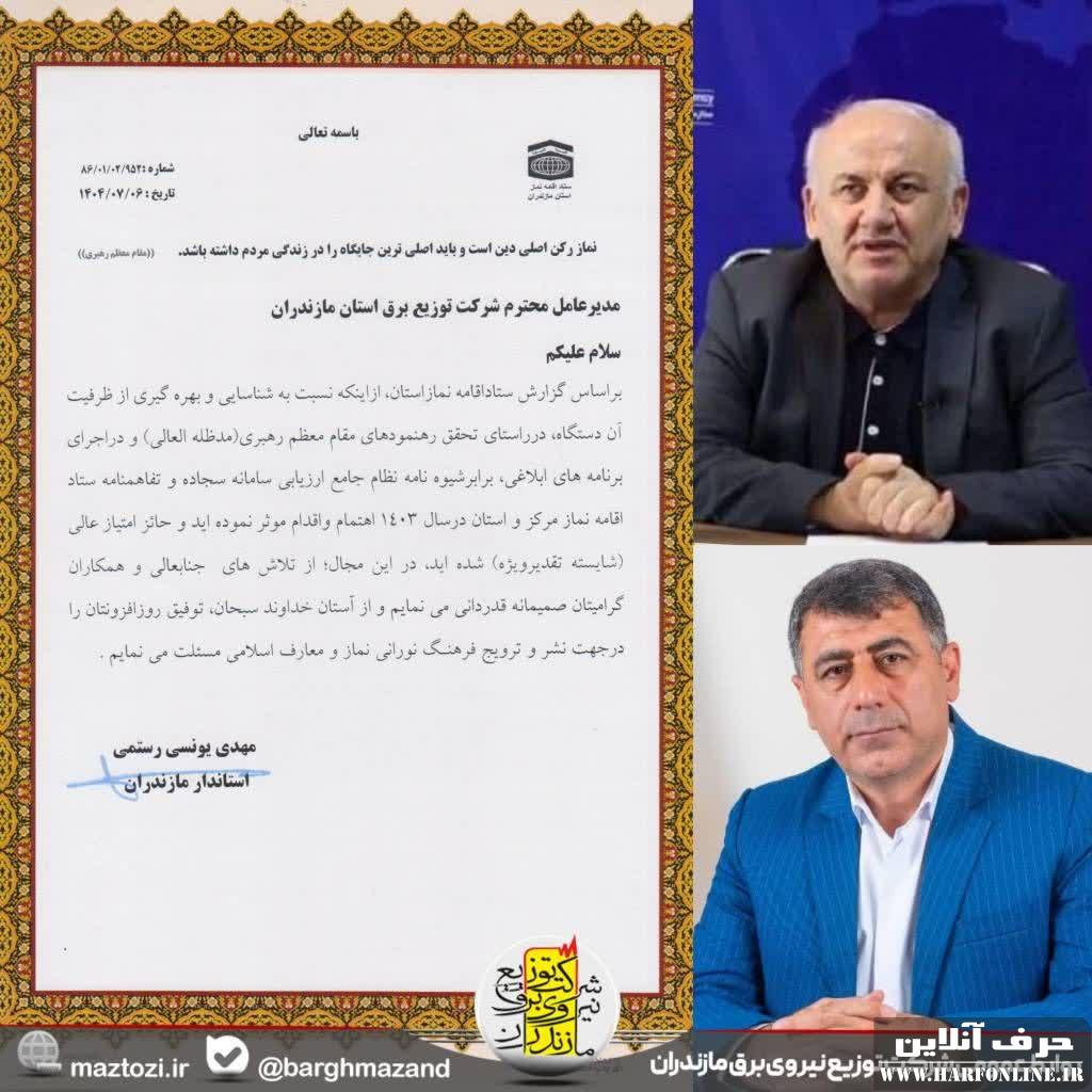 دکتر یونسی رستمی، استاندار مازندران با ارسال لوح سپاس از مهندس سید کاظم حسینی کارنامی مدیرعامل شرکت توزیع نیروی برق مازندران، به پاس کسب رتبه عالی و اقدامات موثر در بهره گیری از برنامه ابلاغی و شیوه نامه جامع ارزیابی عملکرد ستاد اقامه نماز استان مازندران در جهت نشر و ترویج فرهنگ نورانی نماز تقدیر و تشکر نمود.