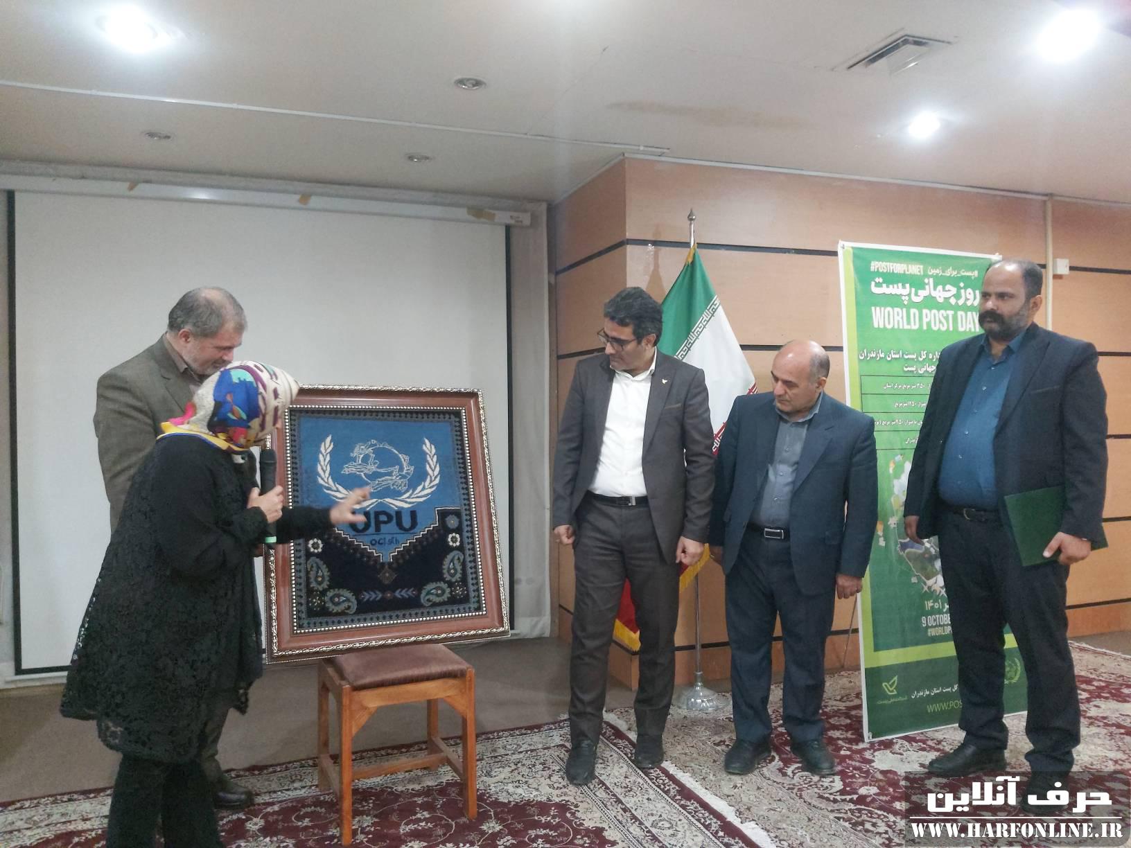 در این مراسم از فرش دستبافی که به مناسبت روز جهانی پست با طرح لوگوی اتحادیه پستی جهانی توسط یک هنرمند مازندارنی خلق شده است، رونمایی شد.