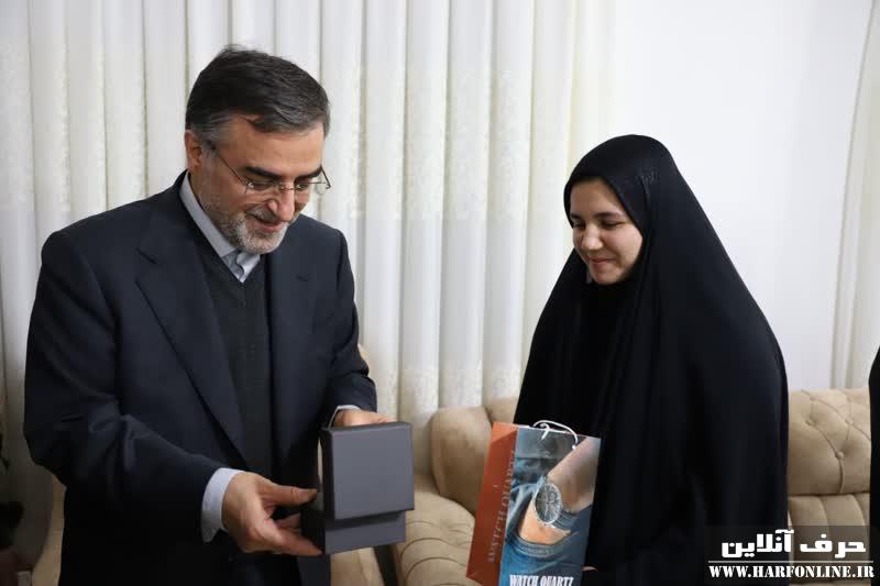 نرگس خانم که کیک تهیه کرده بود، آن را برش و استاندار هدیه دختر و پدر شهید رو تقدیم کرد و نرگس هم کادویی که برای استاندار گرفته بود را هدیه داد.