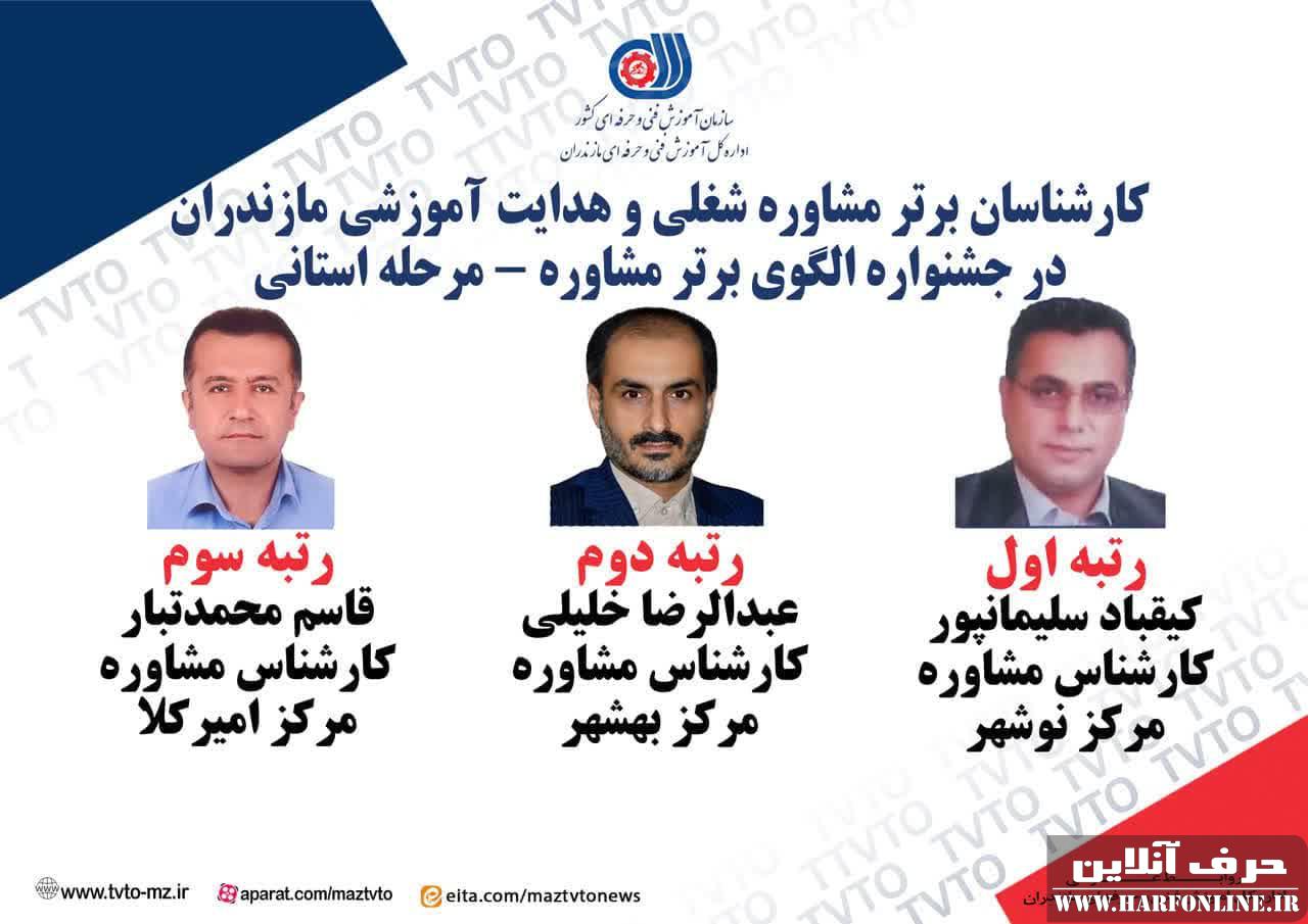 مدیرکل آموزش فنی حرفه ای تصریح کرد : در این جشنواره پس از بررسی عملکرد مشاوران در طول یک سال، آزمون های کتبی و عملی اخذ می گردد و نهایتاً نفرات برتر استان مشخص و به مرحله کشوری راه می یابندکه در استان از بین ۱۸ کارشناس مشاوره آقایان کیقباد سلیمانپور از نوشهر- عبدالرضا خلیلی تیرتاشی از بهشهر و محمد قاسم تبار از امیرکلا موفق به کسب رتبه های اول تا سوم شدند.