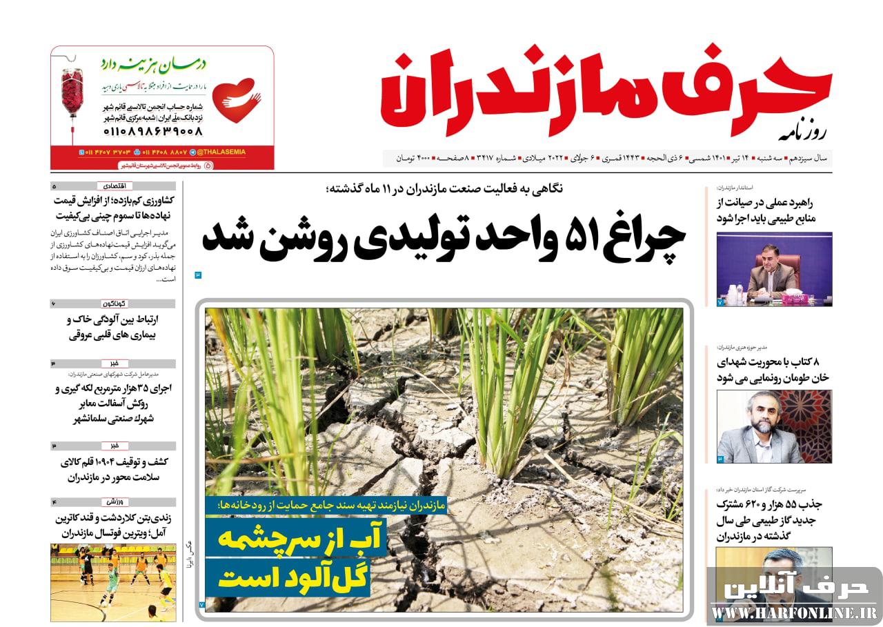 نسخه الکترونیک روزنامه حرف مازندران -سه شنبه 14تیر+شماره 3417