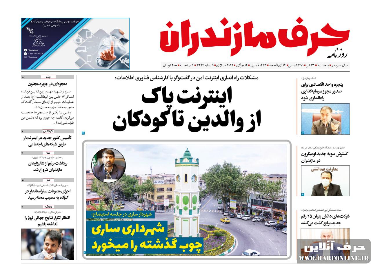نسخه الکترونیک روزنامه حرف مازندران -پنجشنبه 23تیر-شماره 3424
