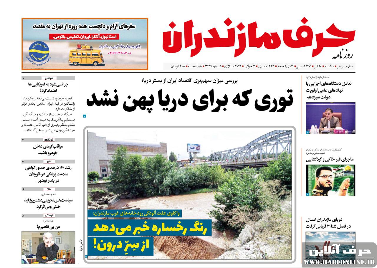 نسخه الکترونیک روزنامه حرف مازندران -دوشنبه 20تیر – شماره 3421
