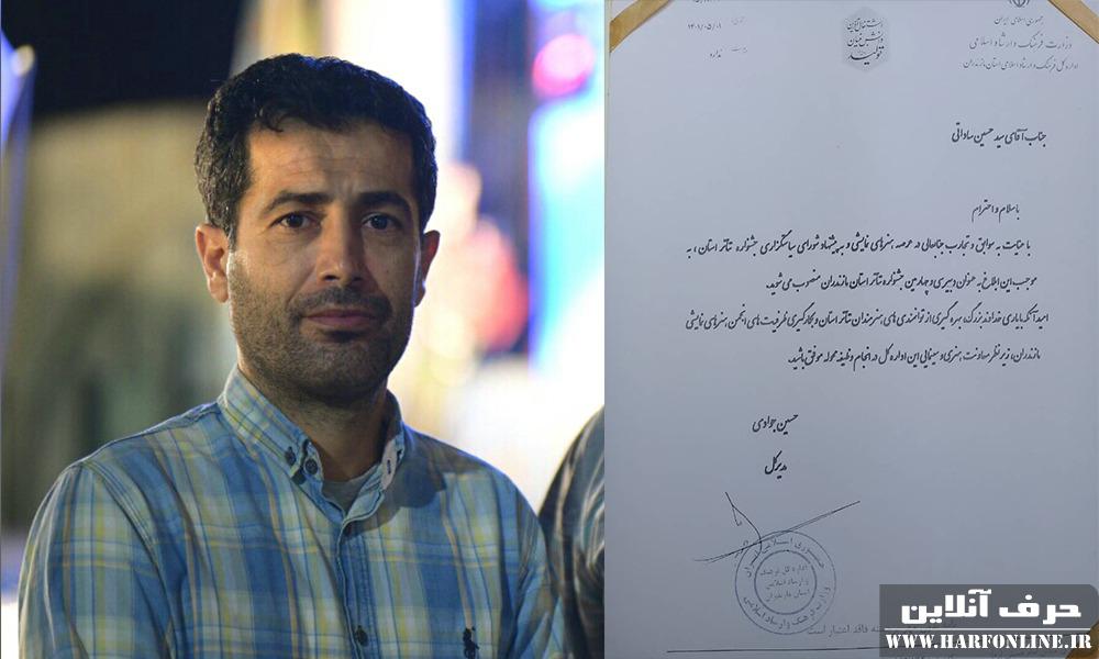 جناب آقای سید حسین ساداتی، با سلام و احترام با عنایت به سوابق و تجارب جناب عالی در عرصه هنرهای نمایشی و به پیشنهاد شورای سیاستگزاری جشنواره تئاتر استان، به موجب این ابلاغ به عنوان دبیر سی و چهارمین جشنواره تئاتر استان مازندران منصوب میشوید.