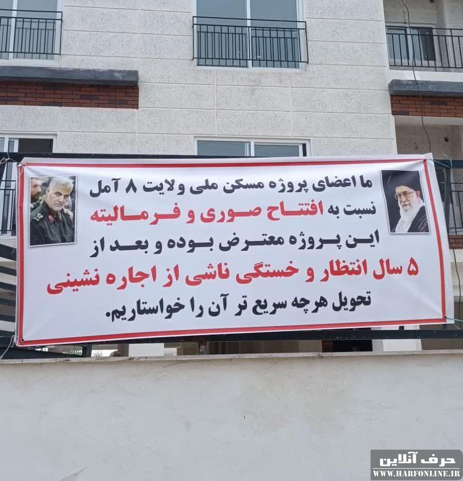 طی هفته گذشته، بنری جالب بر سر در پروژه مسکن ملی آمل از سوی صاحبان این واحدها نصب شده است: ما اعضای پروژه مسکن ملی ولایت 8 آمل نسبت به افتتاح صوری و فرمالیته این پروژه معترض شدند.