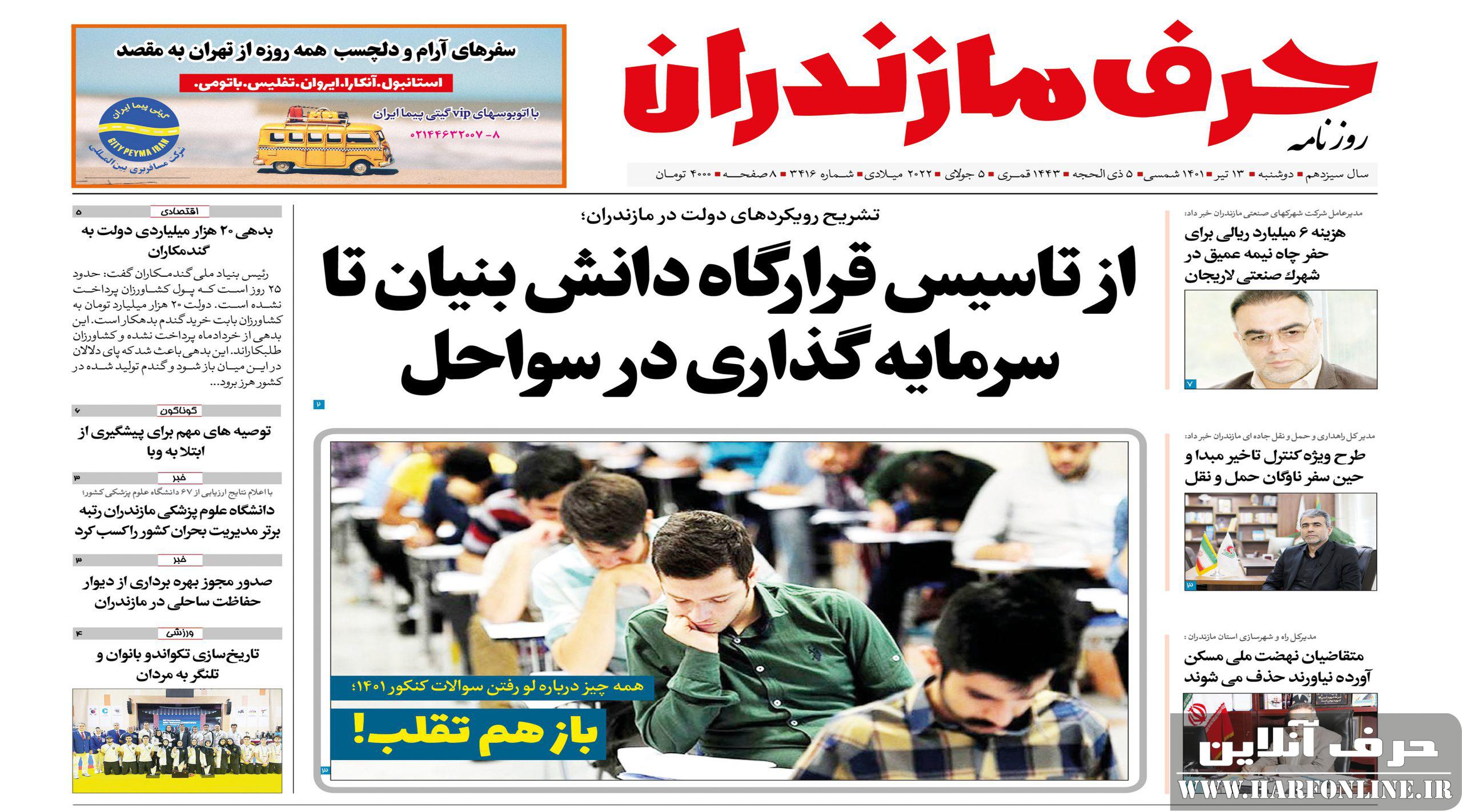 نسخه الکترونیک روزنامه حرف مازندران -دوشنبه -13 تیر- شماره 3416