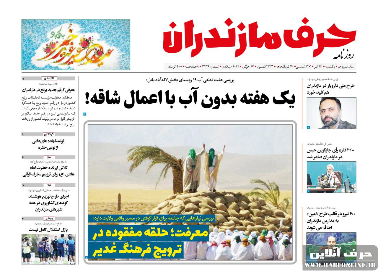 نسخه الکترونیک روزنامه حرف مازندران _یکشنبه ۲۶ تیر_شماره ۳۴۲۶